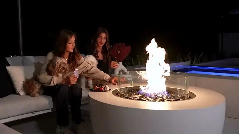 Une plaque de verre optionnelle permet une conversion facile en table basse lorsque la cheminée n’est pas utilisée.